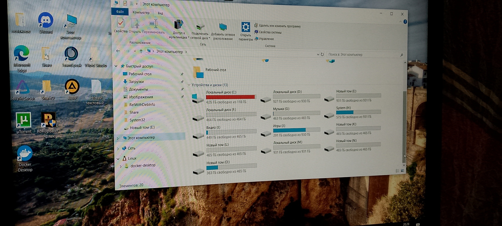 Диск C: точно надо будет обновить первым) Там стоит m.2 жесткий, который сожран Docker'ом и другими прогами для сети. Я его не менял, т.к. хотел сначала шкафом занятся, а потом ломать велосипед. Но со шкафом опять беда. Пришлось отменить заказ и вернуть кэцэ, т.к. зарплату после отпуска насчитали как-то странно.
