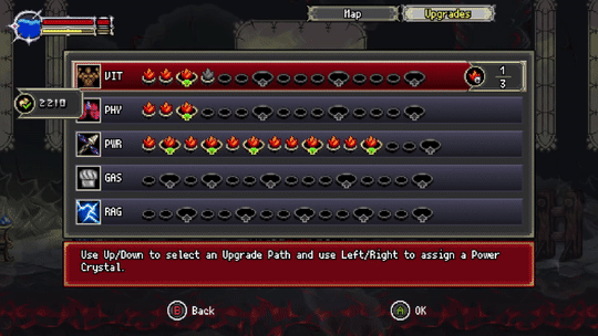 А где рудиментарная прокачка, там и рудиментарная экипировка… Которую тоже можно прокачивать! Т.ч. мы имеем дело с RPG-уроборосом, пожирающим самого себя! Впрочем, много уж чести называть экипировкой это… Ну правда. За всю игру вы найдёте всего четыре чудо-побрякушки, делающие примерно то же самое, что и пассивки в меню прокачки. И то вы их даже не найдёте, а выкупите у местного барыги, что служит единственным весомым обоснованием наличия денег. Прокачивается же эта рухлядь лишь единожды и требует для перековки редчайшие жемчужины, которые спрятаны в самых-самых потаённых норах погибшего королевства.