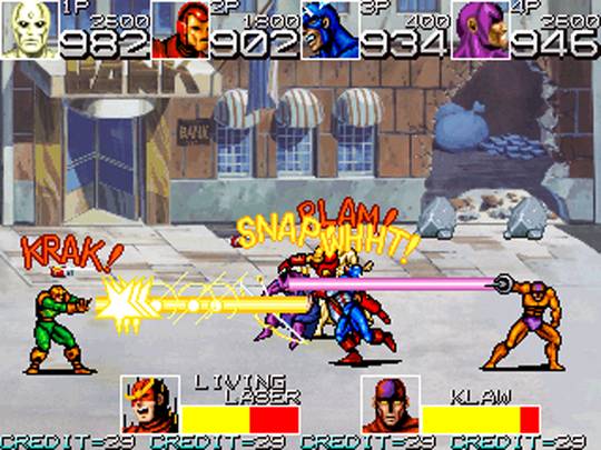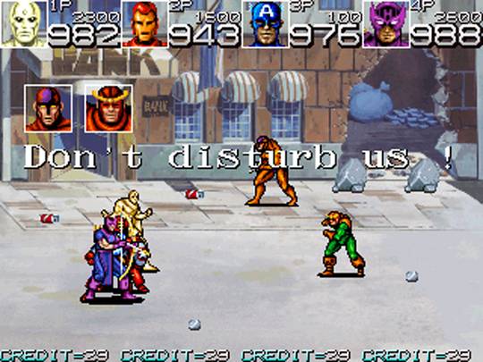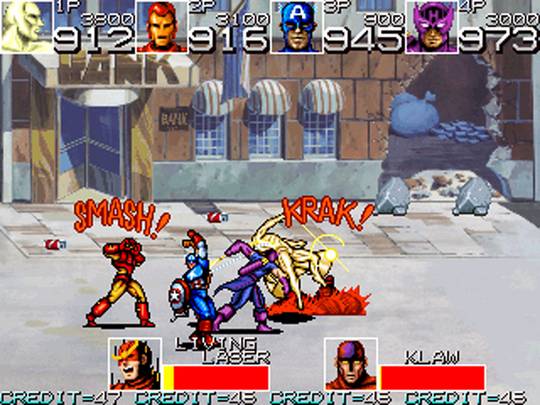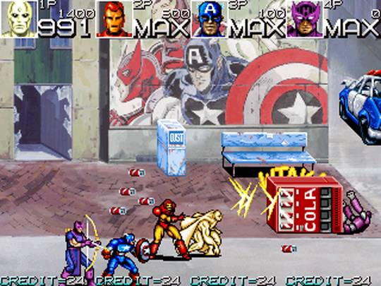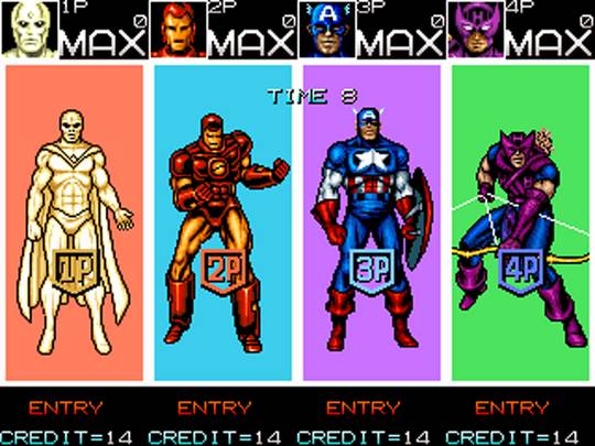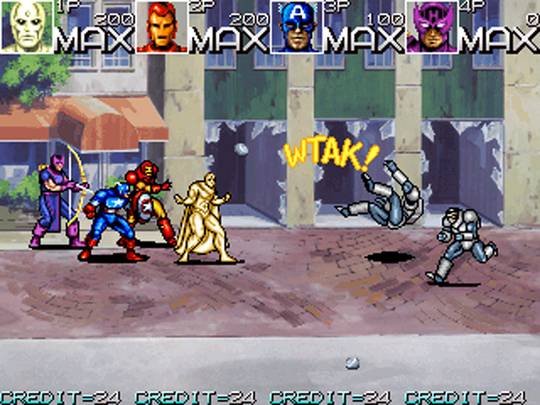 Классический битэмап по мотивам комиксов Marvel. Красный череп собрал армию суперзлодеев и мелких приспешников, и собирается с их помощью захватить мир. Остановить его может только легендарная команда супергероев «Мстители». Управлять можно одним из четырёх героев: Капитаном Америка, Железным человеком, Соколиным глазом или Вижном. Каждому персонажу доступен как привычный рукопашный бой, так и различные метательные предметы, в изобилии разбросанные по уровням, а также особая дальнобойная атака: метательное оружие (щит Капитана Америка и стрелы Соколиного глаза) или энергетический выстрел (Железный человек и Вижн). В прыжке Капитан Америка и Соколиный глаз наносят удар ногой, в то время как Железный человек и Вижн делают энергетический залп под углом в 45 градусов. Другие Мстители, такие как Оса, Ртуть, Чудо-человек и Нэмор могут появиться, чтобы подкинуть нашим героям аптечку, наложить полезный статусный эффект или расчистить путь.