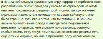 Короткая инди-хоррор игра от сербского соло-разработчика Vivi. Главный герой юный поваренок, цель которого накормить гостей, выяснить, куда делся предыдущий выпускник кулинарного техникума и выжить самому.