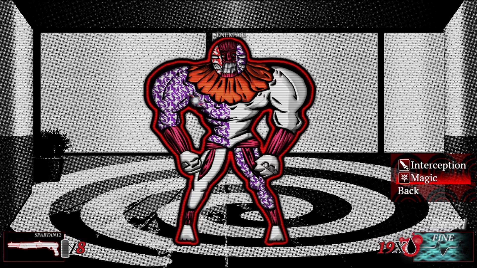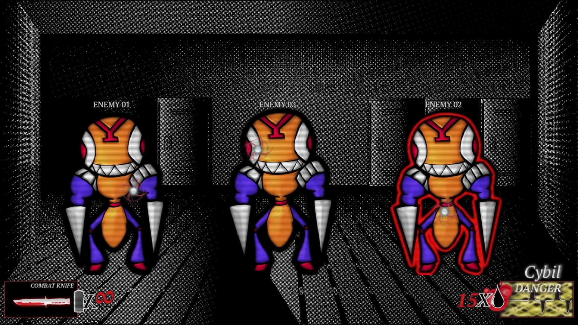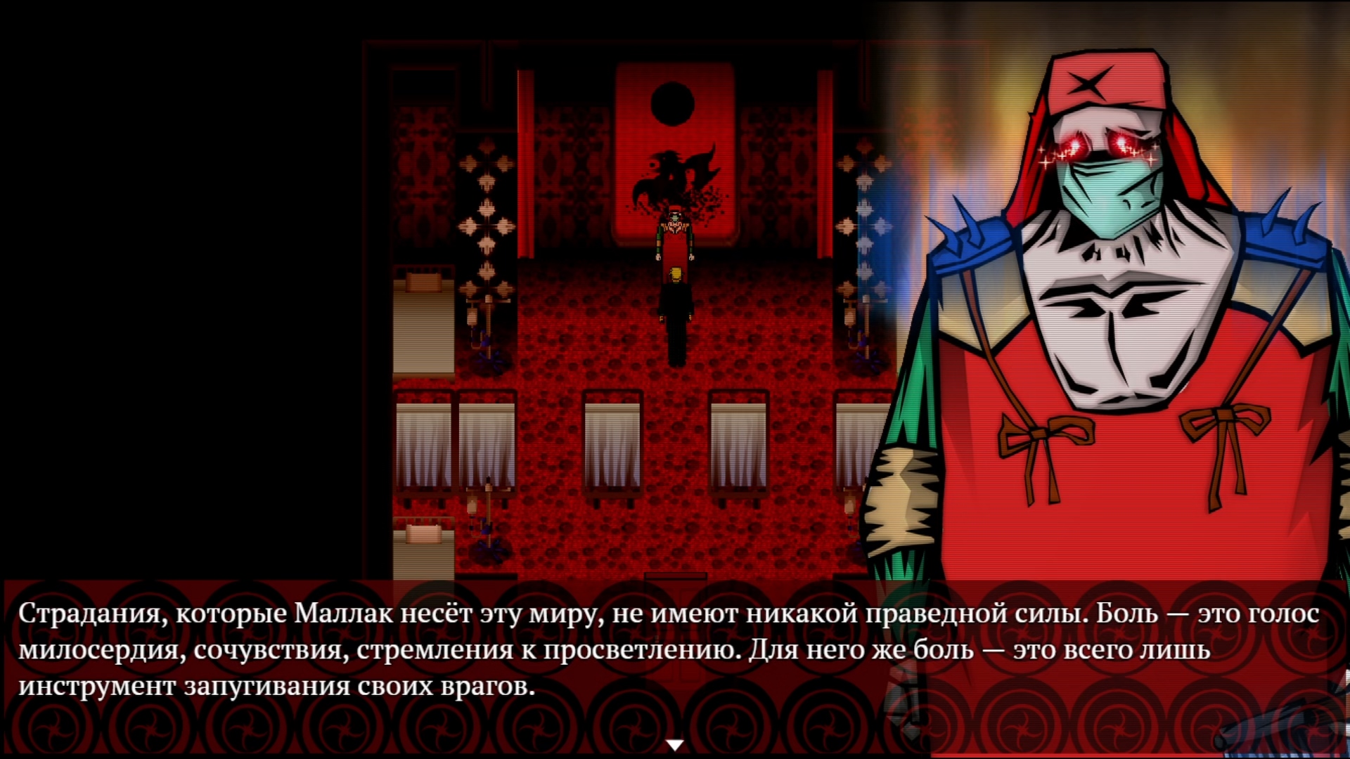 И пока мы не перешли к геймплейному мясу, надо всё-таки высказаться по поводу того, что уже продолжительное время насилует ваши глаза. Да-а-а… Графика в Mind Control очень специфичная. В ней уживается столько всего. И схематичное пиксельное окружение, и пропорциональные спрайты персонажей, и стилизованные угловатые портреты с толстенной обводкой, и кучи, КУЧИЩА гротескного насилия. И это, если можно так выразиться, «нормальная» сторона здешней графики. Всякая хтонь вроде монстров, преисподней и кошмаров с галлюцинациями тут очень пёстрая. Особенно монстры, многие из которых карикатурны настолько, что из них получились бы неплохие плюшевые игрушки. Смотришь на них и думаешь: «мне сейчас пугаться или улыбаться?»